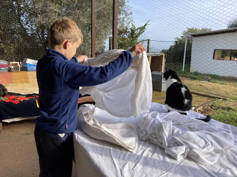 Am nächsten Tag haben wir gleich losgelegt. Die Jungs haben den Hundezwinger gereinigt, die Katzenboxen ausgespült, die Tiere versorgt und vor allem die Hunde dolle geknuddelt. Jasper hat Snowy in sein Herz geschlossen und Lenni ist ein großer Olaf-Fan! Olaf wurde vor 4 Jahren als Welpe über Corinnas Zaun geworfen und hat sich dabei die Hinterbeine verletzt. WER MACHT DENN BITTE SOWAS??? Aber jetzt hat er ein tolles Leben und darf auf dem Hof den großen Beschützer spielen.