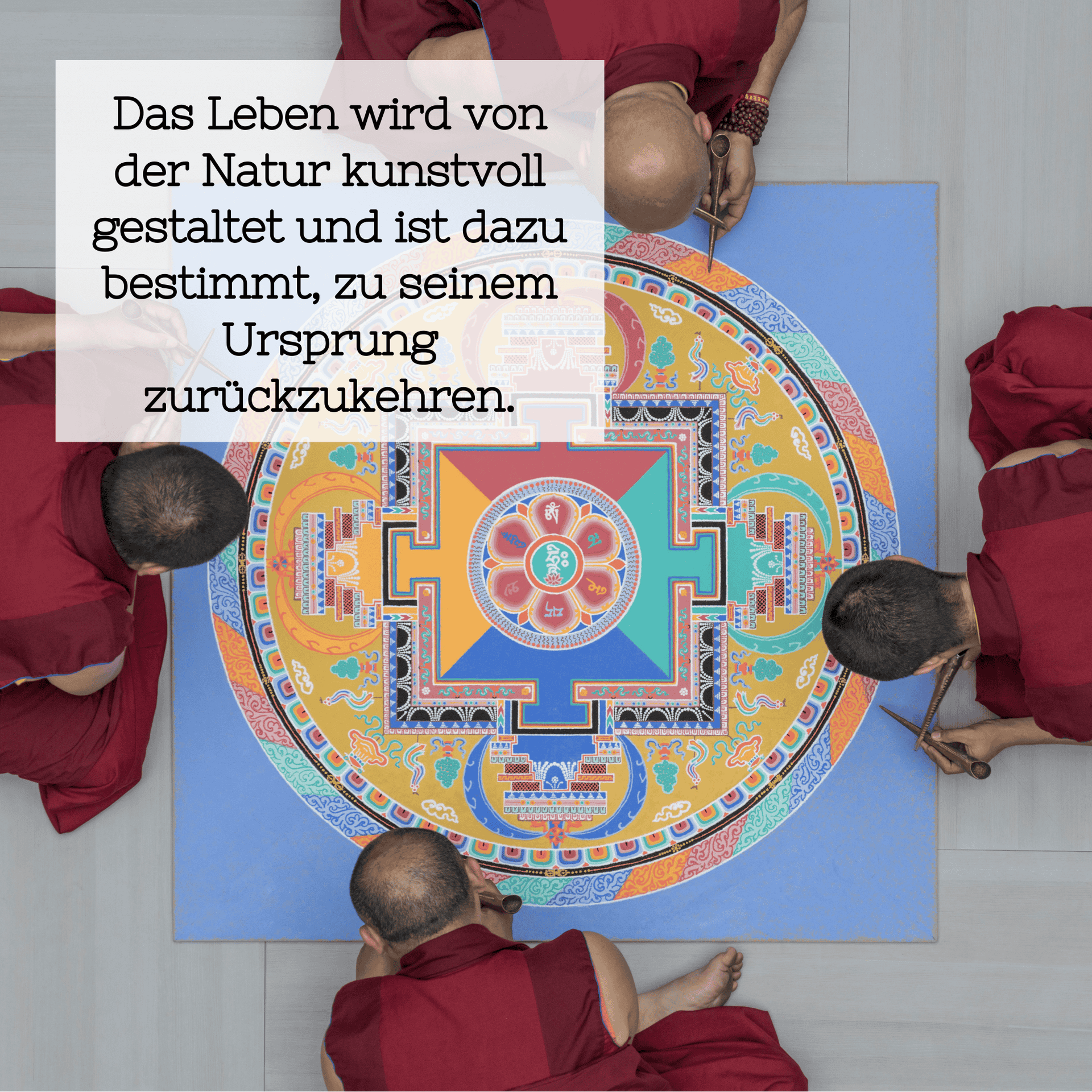 Im vierten Kalenderblatt dreht sich alles um das Thema Mandala und dessen tiefere Bedeutung für unser Leben und Sterben. Samten, der bereits in vielen europäischen Städten Mandalas erschaffen und wieder aufgelöst hat, betont, wie wertvoll dieses Ritual sein kann, um sich mit der eigenen Vergänglichkeit und dem bewussten Loslassen auseinanderzusetzen.