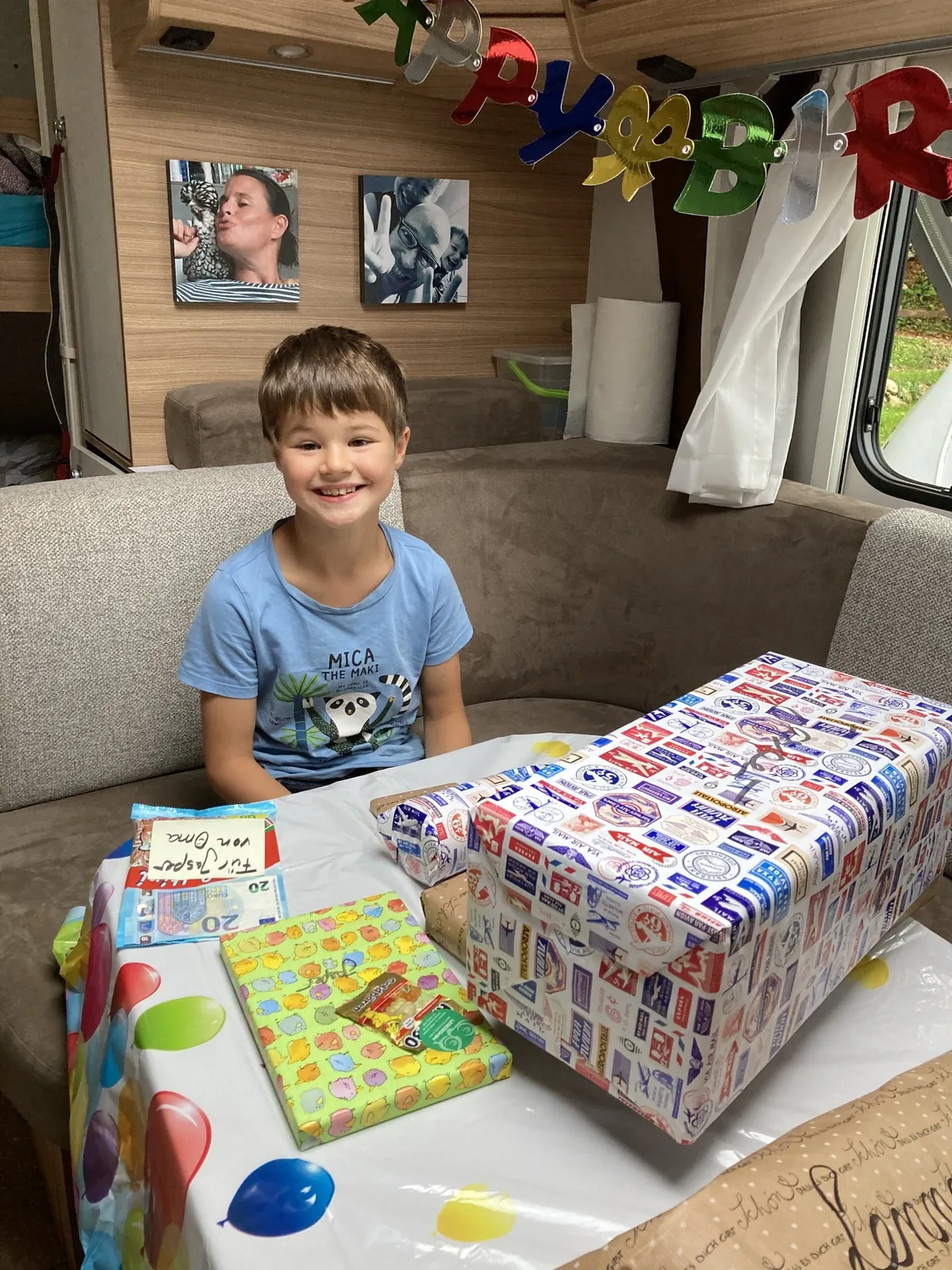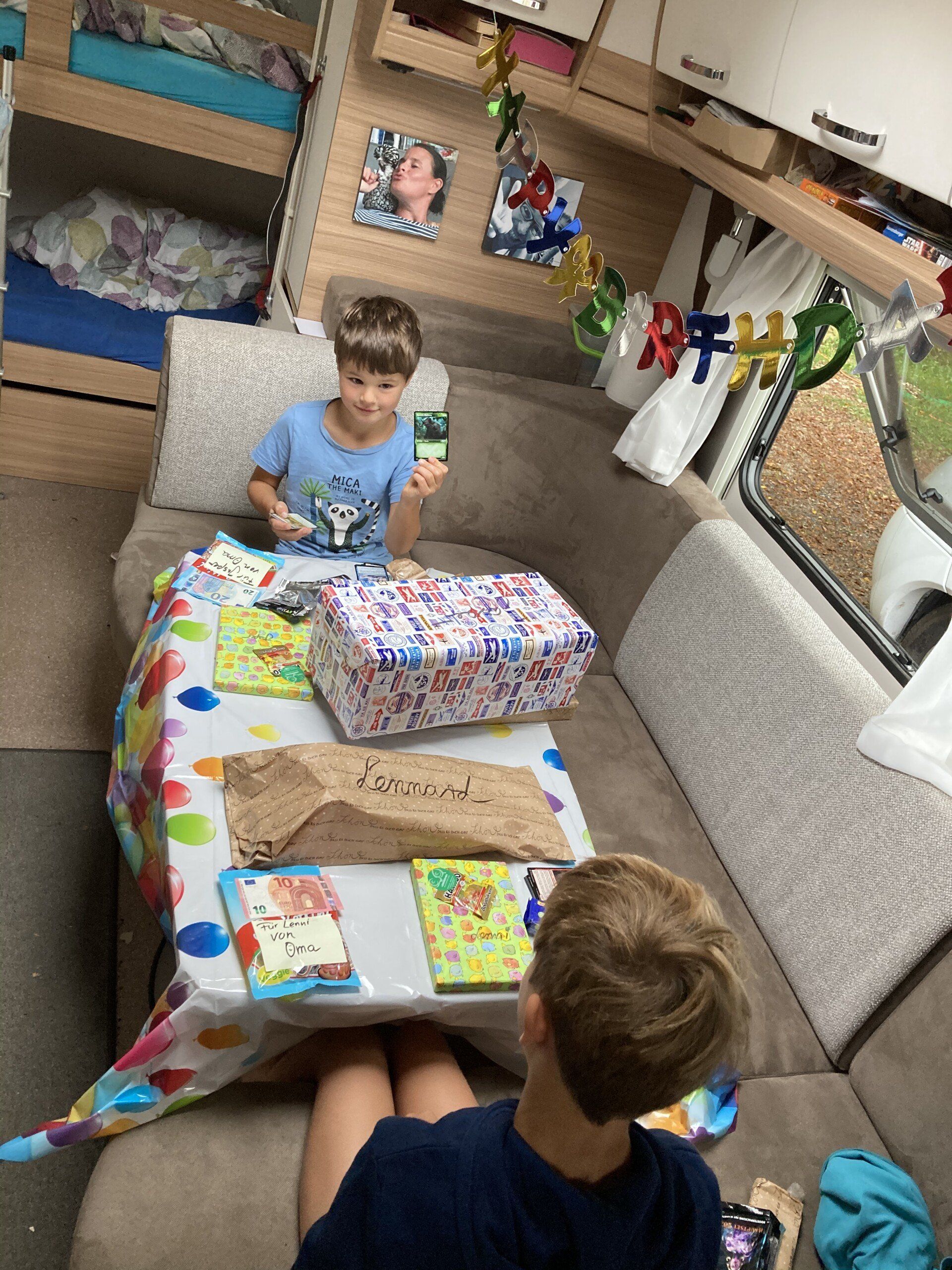 Ich habe den Geburtstagstisch im Wohnwagen gedeckt, die Girlande aufgehängt und den Kuchen vorbereitet. Die Geschenke haben wir teils aus Gehrden noch mitgenommen, teils in Salzburg gekauft und unter unserem Bett und den Kleiderfächern versteckt.