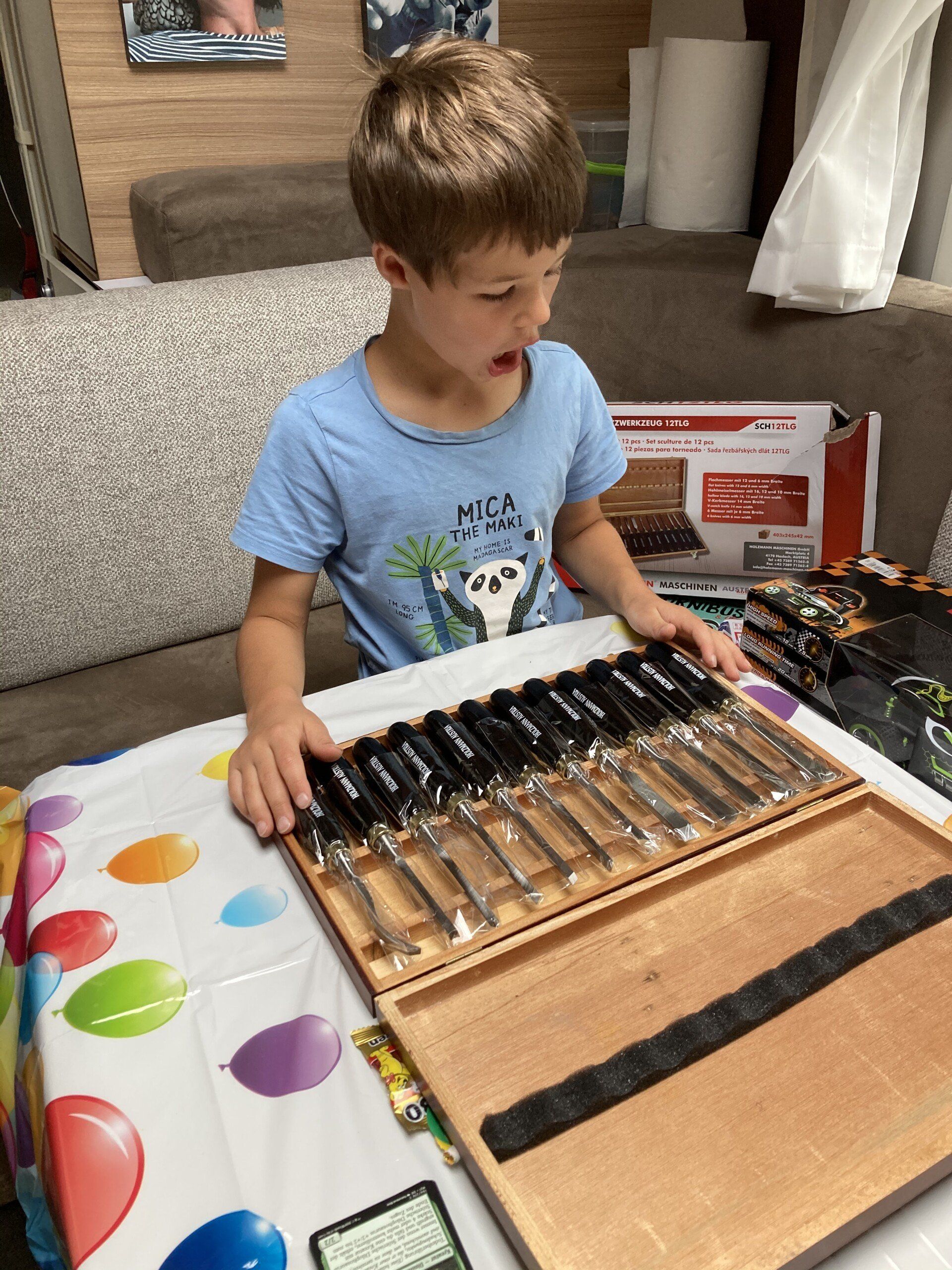Jasper hat ein Schnitzset, einem Holzschläger (inkl. Holz zum Üben) und ein ferngesteuertes Auto geschenkt bekommen. Ui, da war die Freude groß!