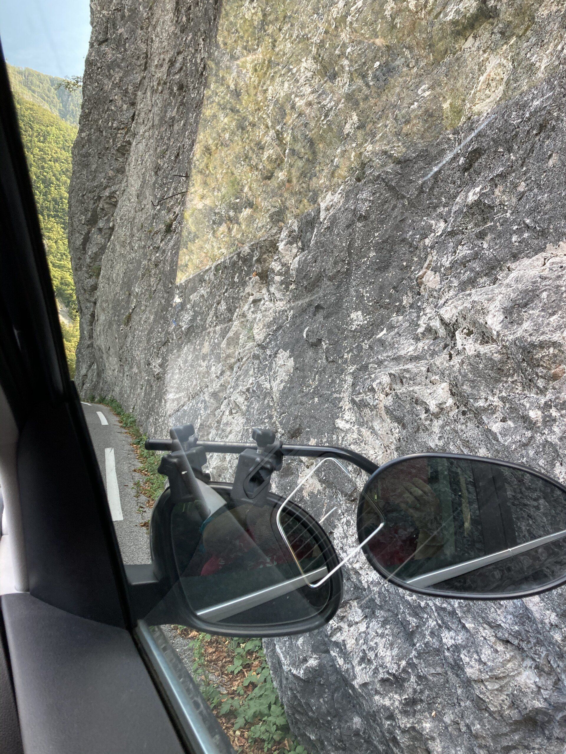 Eine Steinklippe hat dann doch unseren Wohnwagen touchiert und ein paar unschöne Kratzer hinterlassen. Das passierte beim Versuch, auf einer viel zu engen Abfahrt aneinander vorbei zu kommen.