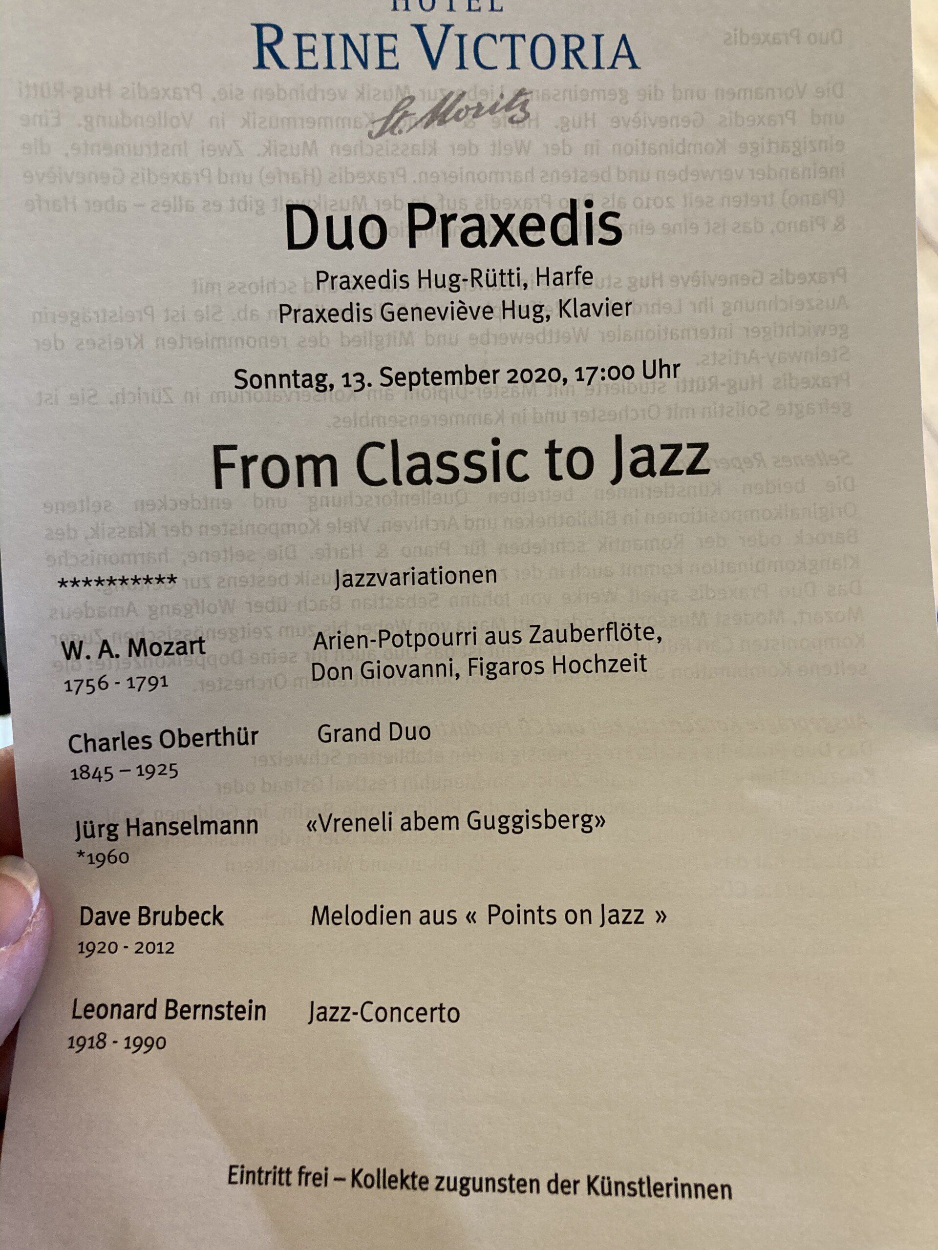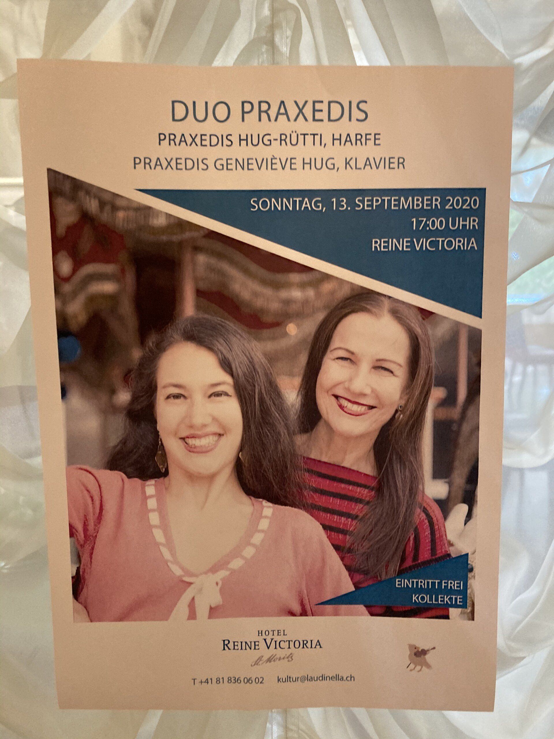 Einen wunderschönen „nur-ich-Ego-Abend“ durfte ich am 13.09.2020 im Hotel Reine Victoria mit dem „DUO PRAXEDIS“ erleben. Ein Harfe- und Klavier-Konzert. Balsam und Streicheleinheiten für die Seele!